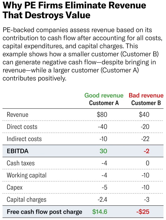 As empresas apoiadas por PE podem justificar essa abordagem porque se concentram na valorização da empresa e entendem que o crescimento da receita não aumentará esse valor a menos que também melhore o fluxo de caixa — a receita, afinal, após todos os custos diretos, custos indiretos, necessidades de reinvestimento (capital de giro e despesas de capital), impostos e uma taxa de “custo de capital” serem contabilizados. A boa receita aumenta o fluxo de caixa, e a receita ruim o reduz ou contribui com menos do que o necessário para compensar os detentores de dívida e de ações.
